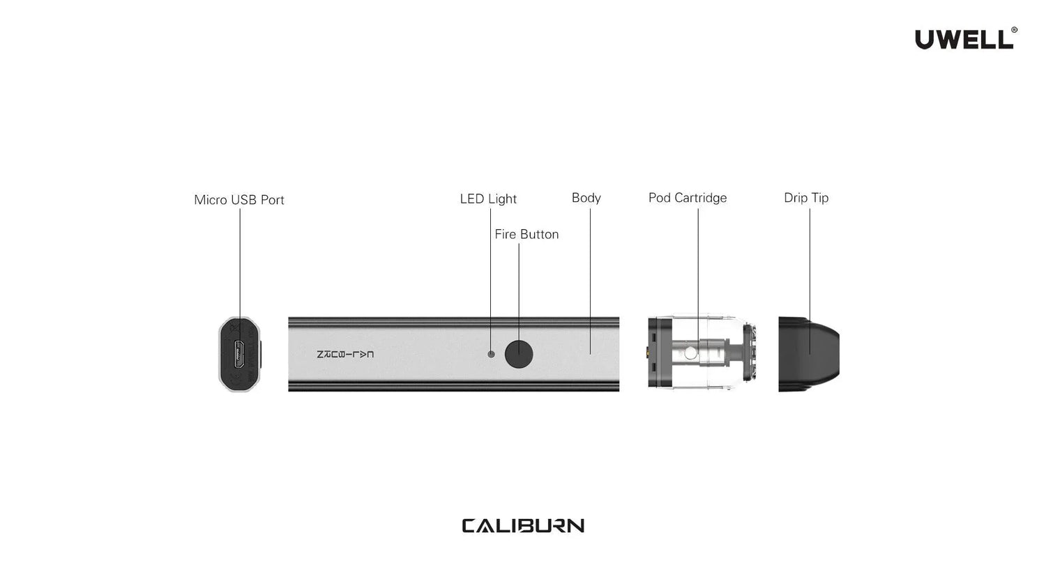 Uwell’s first pod-style vape. Vaping made safe and simple. The Uwell Caliburn uses a dual output system, which means vapour can be produced simply by inhaling on the device, or by pressing the power button located on the side of the body.